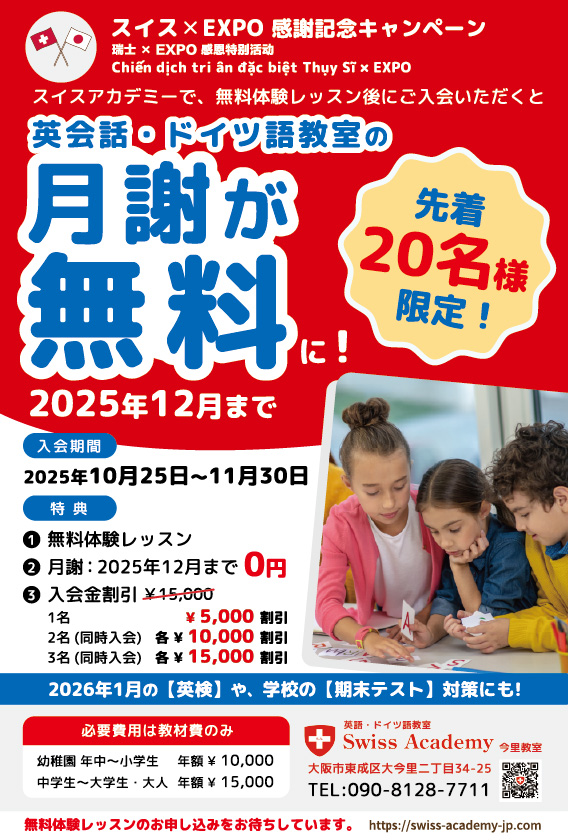 2025年11月11日 / 最終更新日時 : 2025年11月12日 swiss お知らせ スイス ✕ EXPO 感謝記念キャンペーン スイスアカデミーで、無料体験レッスン後にご入会いただくと英会話・ドイツ語教室の月謝が無料に! 2025年12月まで無料体験レッスンのお申し込みをお待ちしています。
