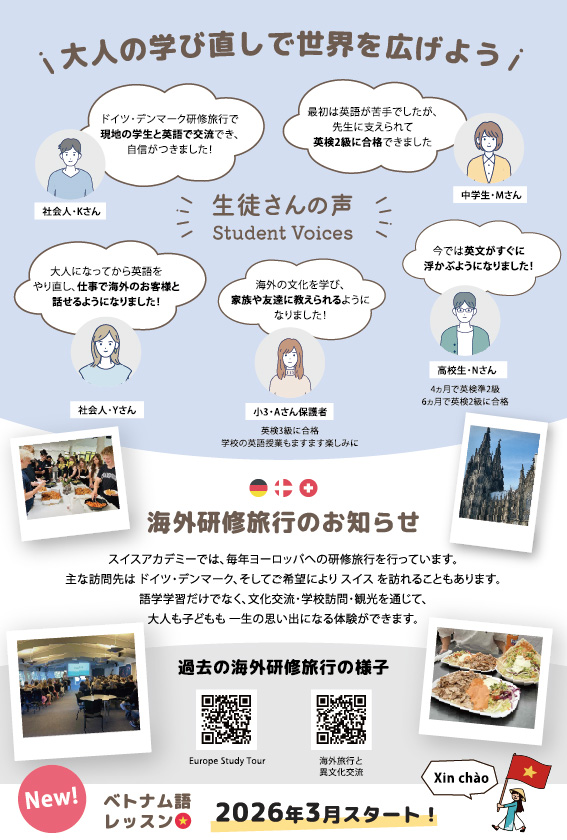 移転を避け、生徒さんが安心して通える場所を守るため、2026年1月から Swiss Academy が全面的にお借りすることになりました。