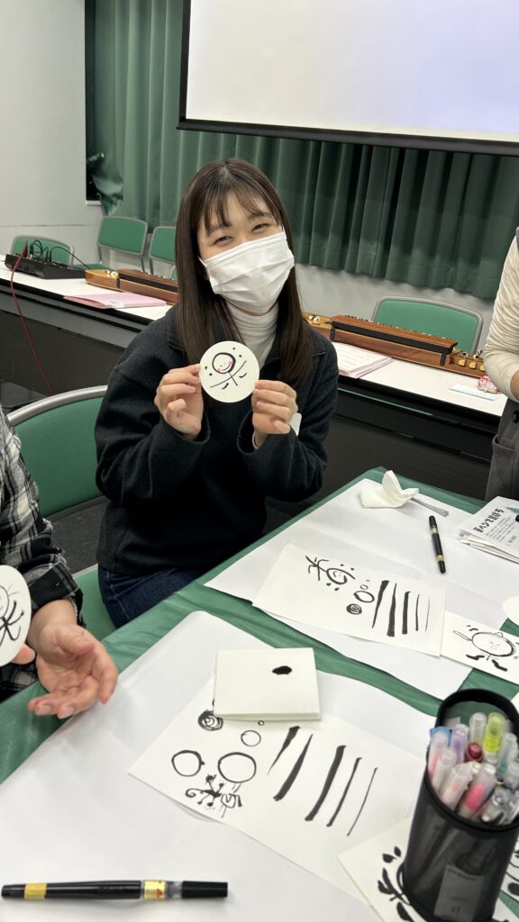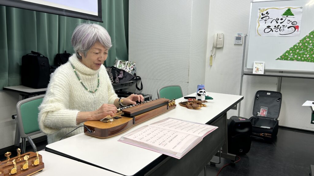 Eine besondere Gastlehrerin leitete die 筆文字アート (Brush Letter Art), und Weihnachtslieder auf Englisch und Deutsch wurden gesungen, begleitet von einer Taishōgoto-Lehrerin und einer Spielerin.