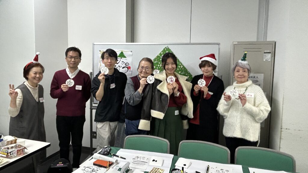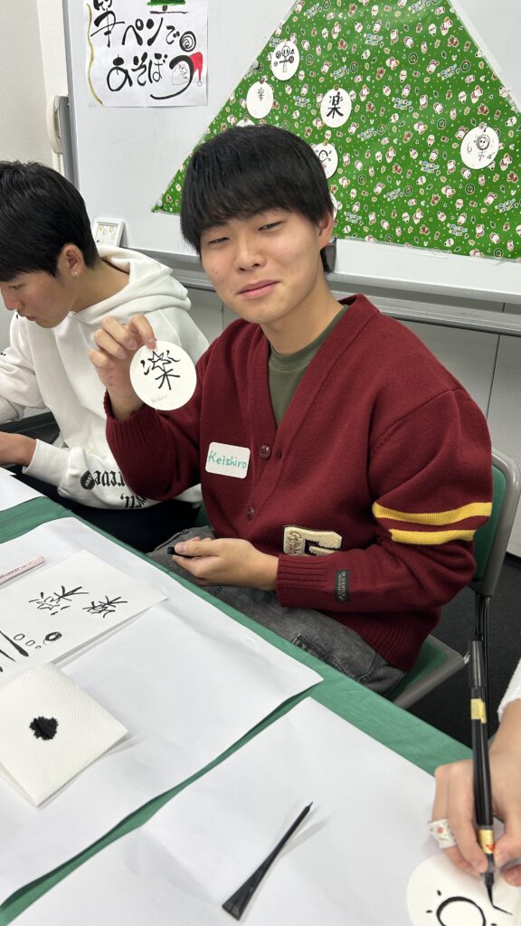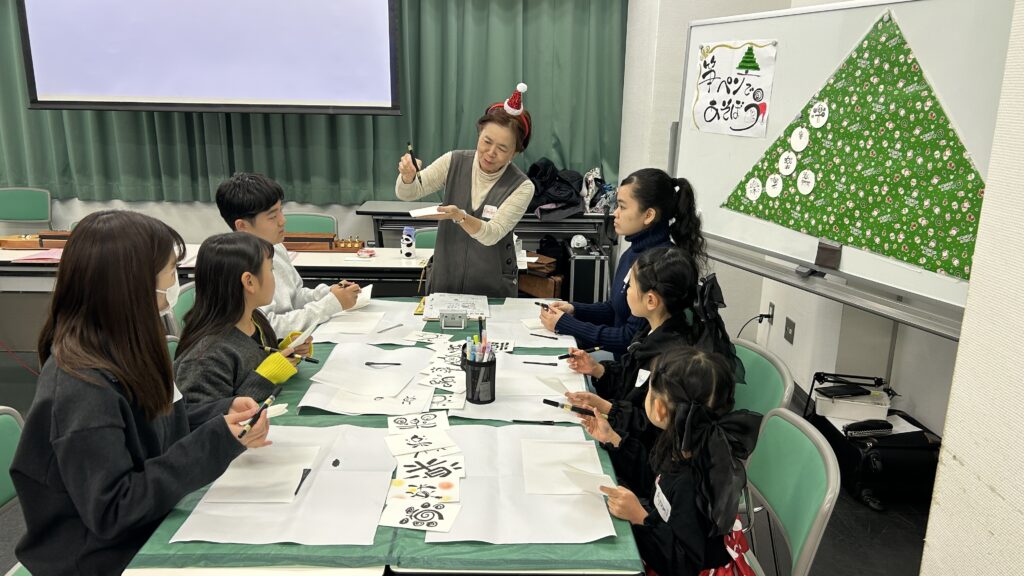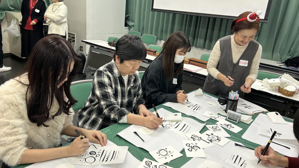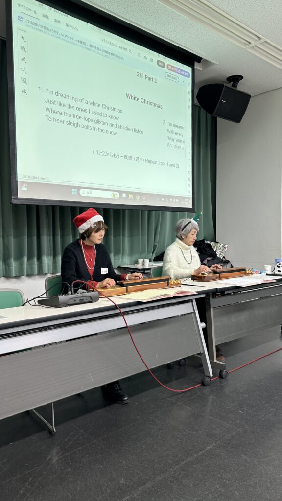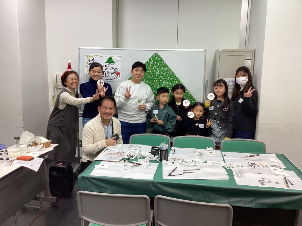 We welcomed a special guest teacher for 筆文字アート (Brush Letter Art), and enjoyed Christmas songs in English and German, accompanied by a 大正琴 teacher and player.